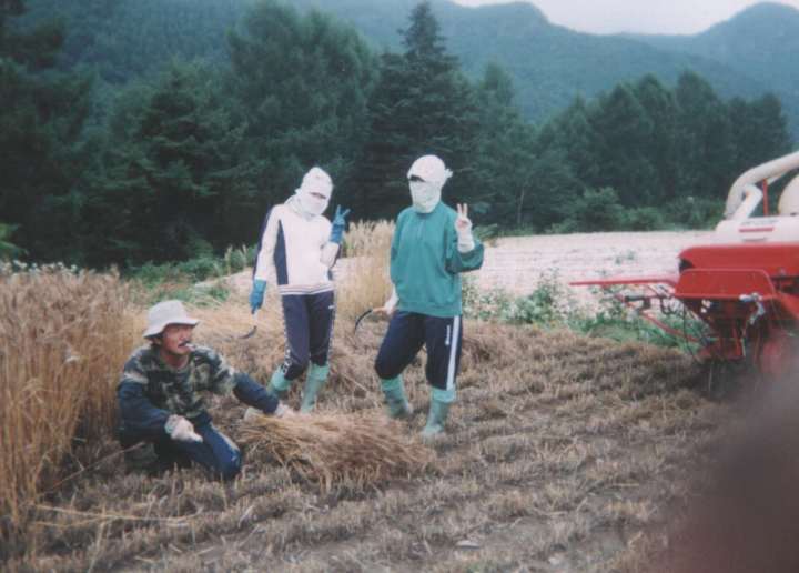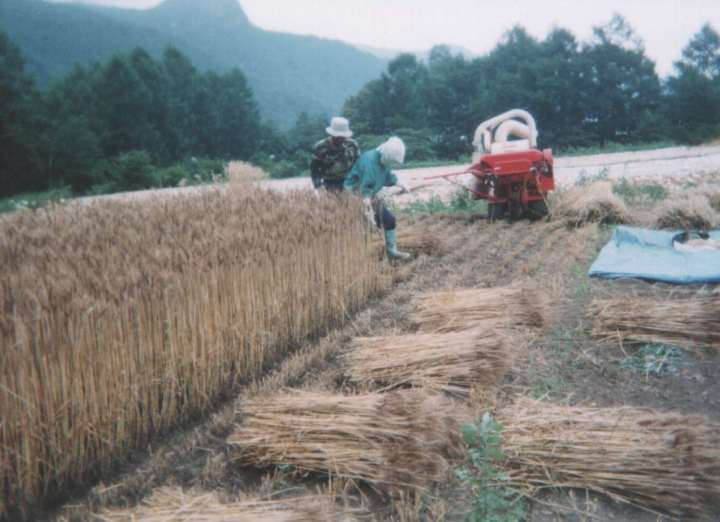 今年は2条バインダーで刈り取り。ただちにハーベスタで脱穀。