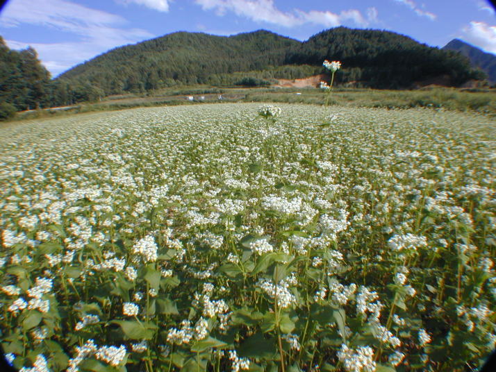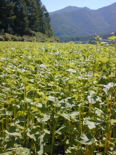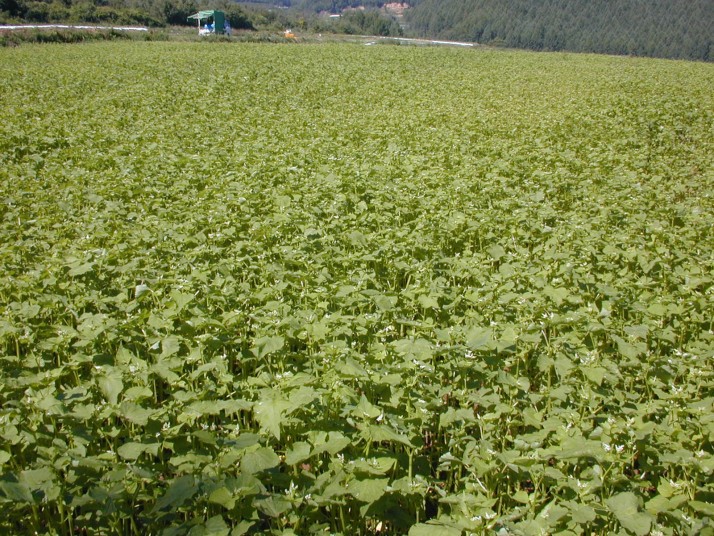 播種は天候を見はからって降雨直前に行い、発芽を一斉に均一にする。この時、雑草種子も発芽するがそばの伸びは速く、雑草を抑制してくれる。播種量は10a当たり6kgで全面ばらまき。