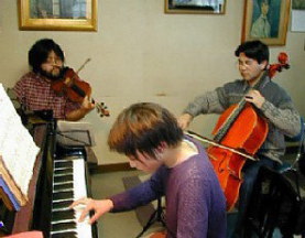 これまでの「ピアノ・サロン」では、ピアノソロの間に連弾を入れて、プログラムに変化を持たせてきました。子どもたちはこの連弾の勉強を通して、アンサンブルの楽しさを知り、また合わせる技術も身につけることができたと思います。その後過去三回のコンサートにおいては、最初の2回は地元のプロフェッショナルな演奏団体〈アンサンブル・ノーヴァ〉のコンサートマスター・加藤晃さんの参加を得て、バイオリンとのアンサンブルを取り入れました。このようにして本格的な室内楽の演奏を、バイオリンソロとのアンサンブルの形で慣れたところで、前回は芸大チェロ科に学ぶ西山さんの協力も得て、モーツァルトとメンデルスゾーンのピアノ三重奏に取り組んでみました。お蔭様で過去3回のアンサンブルは、バイオリンを演奏していただいた加藤さんに「子どもと共演しているとは思えなかった。立派な大人の音楽家を相手に、真剣に演奏している気持ちで演奏できた。」とまでおっしゃっていただきました。