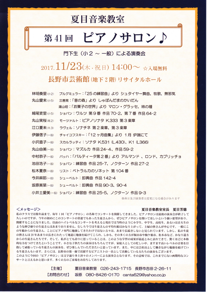 | 下記パンフレットにもご案内の通り、来る11月23日(木・祝日)に長野市芸術館のリサイタルホールにて、「第41回ピアノ・サロン」を開催することとなりました。数年前まで40回にわたり毎年開催してきたピアノサロンですが、今回ピアノサロンの常連の生徒さんより強い希望の声があり、開催の運びとなりました。 ここ数10年あまりの間に、私のクラスでは中年の生徒さんが多く習いに来られるようになりました。一般にこのような年齢になった生徒さんは、なかなか長続きがしないといわれていますが、私の生徒さんに限っては皆さん20年以上にわたって、しかも車で何時間もかかるような遠方から通い続けてきた生徒さんたちです。その地道な努力の甲斐があって、このところ私が当初予想できなかったほどに、技術的にも音楽的にも深みが増してきました。またその多くの方達が音楽大学ピアノ科のような、専門性の高いコースを卒業された方ではありません。それを考えると、なお一層彼らの成長ぶりには感心させられます。そんな演奏を含めて多彩な生徒さん達の演奏を、多くの皆さん楽しんでいただきたく、心よりお誘い申し上げます。 |