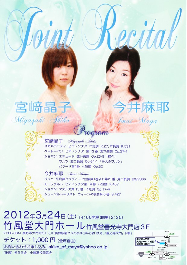 この度私の門下生の今井麻耶さん(武蔵野音楽大学ピアノ科卒)と友人の宮崎晶子さん(東邦音楽大学ピアノ科卒)が、下記の通り「ジョイント・リサイタル」を開催することとなりましたので、お知らせします。多くの皆様にお越しいただきたくご案内申し上げます。