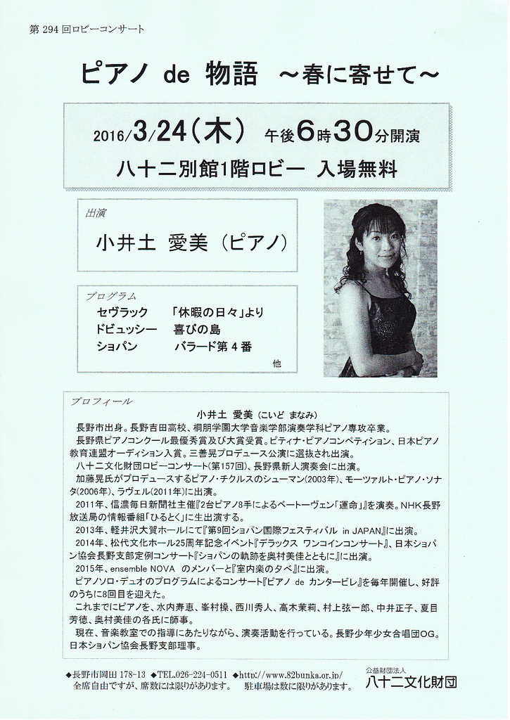 この度私の門下生の小井土愛美さん(桐朋学園大学音楽学部ピアノ科卒)が、下記の通り八十二文化財団主催のロビーコンサート「ピアノ de 物語 〜春に寄せて〜」にて、ソロリサイタルを開催することとなりましたので、お知らせします。