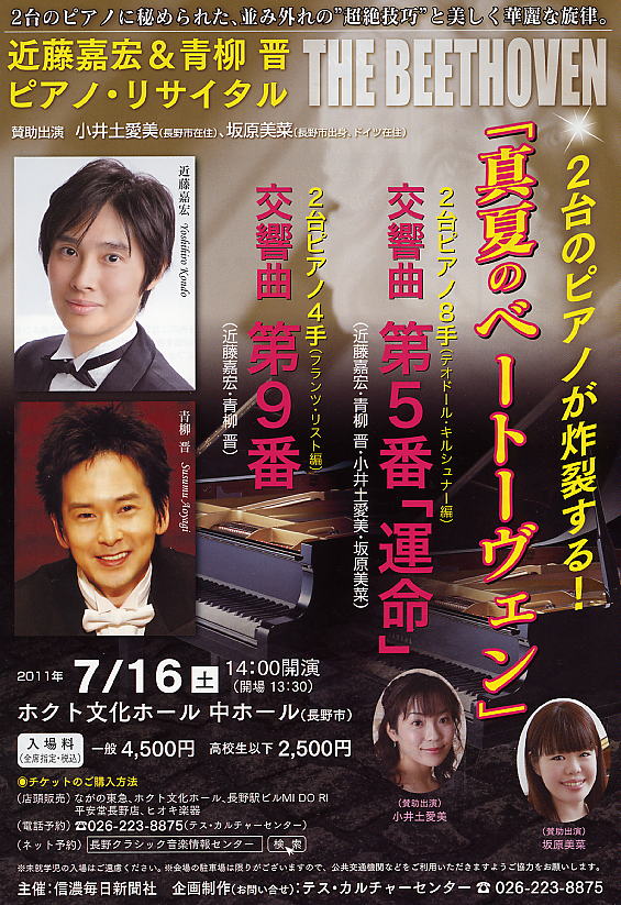 この度私の門下生の小井土愛美さん(桐朋学園大学音楽学部ピアノ科卒)と坂原美菜さん(桐朋学園大学音楽学部ピアノ科卒、現在ドイツハンブルク音楽院在学中)が、下記の通りピアニスト近藤嘉宏氏と青柳晋氏との共演で、ベートーヴェンの交響曲第5番を8手連弾で演奏することになりました。