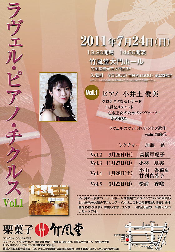この度私の門下生の小井土愛美さん(桐朋学園大学音楽学部ピアノ科卒)が、下記の通りバイオリニスト・加藤晃さんがプロデュースする5回にわたる「ラヴェル・ピアノ・チクルス」の第1回のピアニストを務めることになりました。多くの皆様にお越しいただきたくご案内申し上げます。