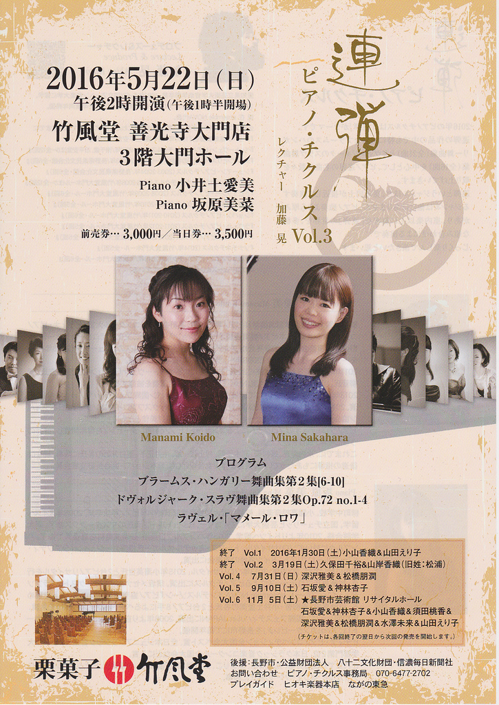 この度私の門下生の小井土愛美さん(桐朋学園大学音楽学部ピアノ科卒)と坂原美菜さん(桐朋学園大学音楽学部ピアノ科・ハンブルク音楽院演奏・芸術家コース終了)が、下記の通り「連弾ピアノ・チクルスVol.3」の演奏会に出演します。