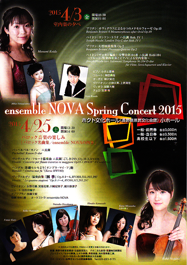 この度私の門下生の小井土愛美さん(桐朋学園大学音楽学部ピアノ科卒)が下記の通りアンサンブル・ノヴァ・スプリングコンサート」の「室内楽の夕べ」に、ピアニストとして参加することになりましたで、お知らせします。
