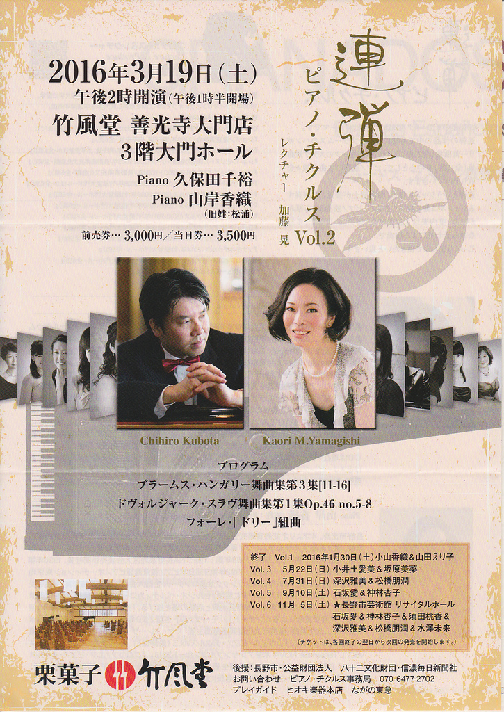 この度私の門下生の山岸香織さん(国立音楽大学ピアノ科卒、長野県ピアノコンクール大賞)が久保田千裕さん(桐朋学園大学音楽学部ピアノ科・ザルツブルグ大学モーツァルテウム音楽院演奏学科コース終了)とチームを組んで、下記の通り「連弾ピアノ・チクルスVol.2」の演奏会に出演します。