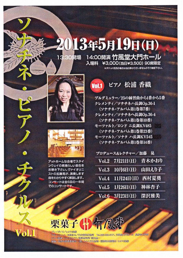 この度私の門下生の松浦香織さん(国立音楽大学ピアノ科卒)が、下記の通りバイオリニスト・加藤晃さんがプロデュースする6回にわたる「ソナチネ・ピアノ・チクルス」の第1回のピアニストを務めることになりました。多くの皆様にお越しいただきたくご案内申し上げます。