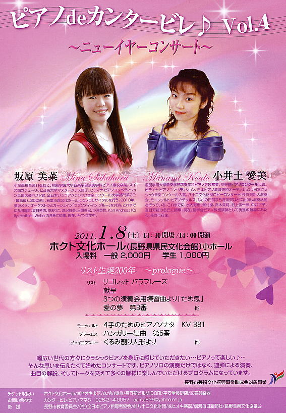 この度私の門下生の坂原美菜さん(桐朋学園大学音楽学部ピアノ科卒)と小井土愛美さん(桐朋学園大学音楽学部ピアノ科卒)が、下記の通り「第4回ピアノdeカンタービレ」を開催することとなりましたので、お知らせします。多くの皆様にお越しいただきたくご案内申し上げます。