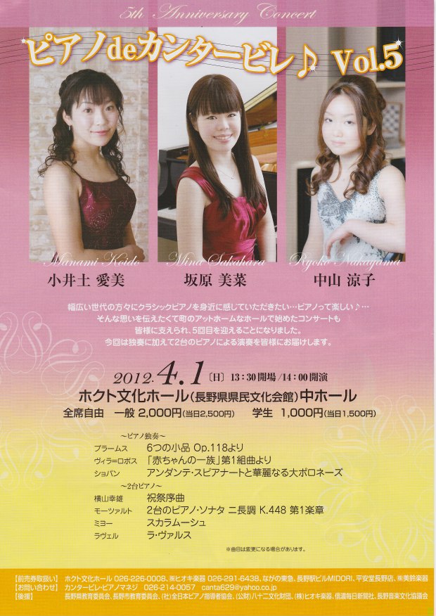この度私の門下生の坂原美菜さん(桐朋学園大学音楽学部ピアノ科卒、現在ドイツ、ハンブルグ音楽院に留学中)と小井土愛美さん(桐朋学園大学音楽学部ピアノ科卒)がお友だちの中山涼子さんの賛助出演を得て、下記の通り「第5回ピアノdeカンタービレ」を開催することとなりましたので、お知らせします。今回は2台のピアノのための曲をメインにしたプログラムです。多くの皆様にお越しいただきたくご案内申し上げます。