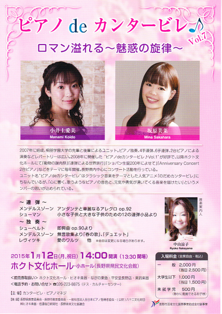 この度私の門下生の坂原美菜さん(桐朋学園大学音楽学部ピアノ科卒、ハンブルグ音楽院・芸術演奏科終了卒)と小井土愛美さん(桐朋学園大学音楽学部ピアノ科卒)がお友だちの中山涼子さんにコンサートのご案内を努めていただき、下記の通り「第7回ピアノdeカンタービレ」を開催することとなりましたので、お知らせします。