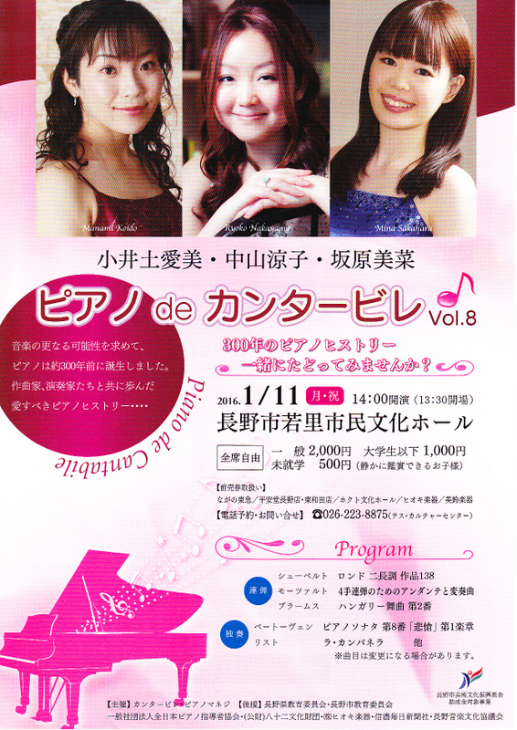 この度私の門下生の坂原美菜さん(桐朋学園大学音楽学部ピアノ科卒、ハンブルグ音楽院・芸術演奏科終了卒)と小井土愛美さん(桐朋学園大学音楽学部ピアノ科卒)と中山涼子さん(桐朋学園大学音楽学部ピアノ科卒)が、下記の通り「第8回ピアノdeカンタービレ」を開催することとなりましたので、お知らせします。