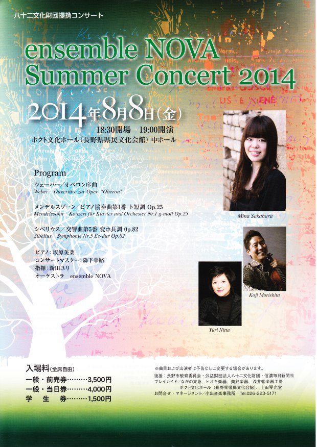 この度、門下生の坂原美菜さん(桐朋学園大学音楽学部ピアノ科卒。ハンブルク音楽院芸術演奏科修了)が、下記の通りアンサンブル・ノヴァのサマーコンサート2014にて、メンデルスゾーンのピアノ協奏曲第1番のソリストとして出演します。
