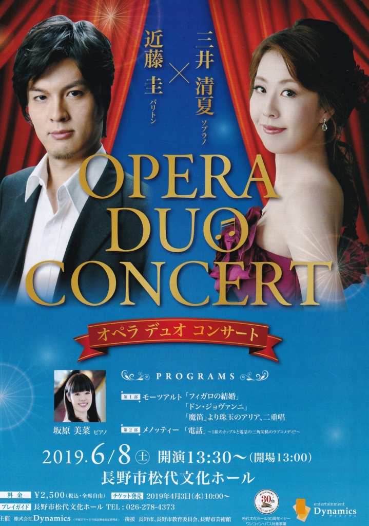 この度私の門下生の坂原美菜さん(桐朋学園大学音楽学部ピアノ科卒、ハンブルグ音楽院・芸術演奏科終了卒)が、ご案内のように近藤圭さん(バリトン)と三井清夏さん(ソプラノ)の「オペラ・デュオ・コンサートの伴奏ピアニストとして出演することとなりましたので、お知らせします。