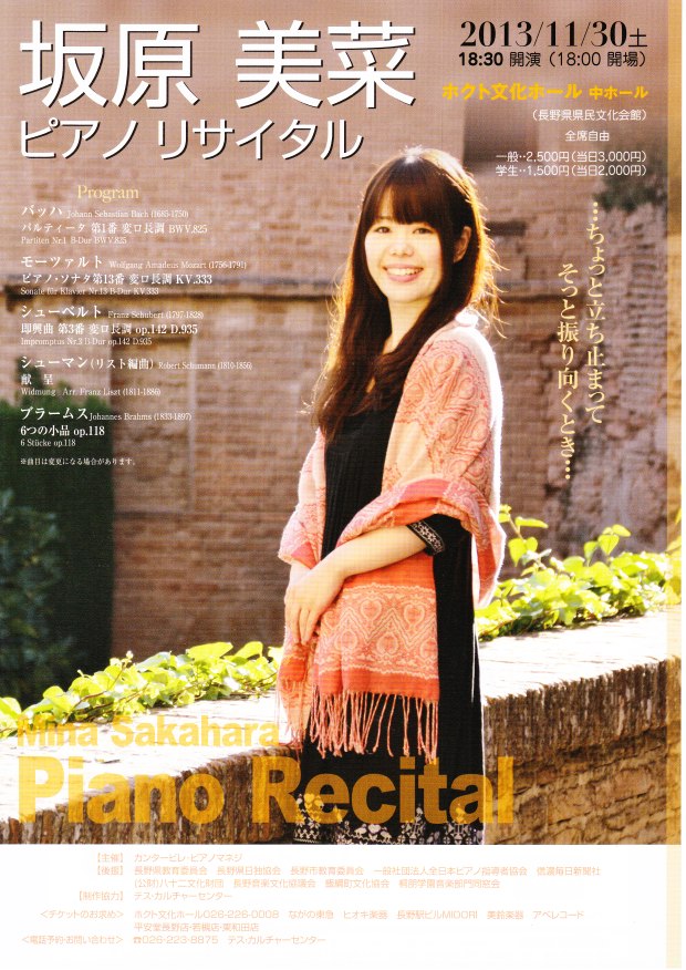 この度私の門下生の坂原美菜さん(桐朋学園大学音楽学部ピアノ科卒)が、3年間のドイツ留学を終えて帰国、下記にご案内の通りピアノ・リサイタルを開催することとなりました。