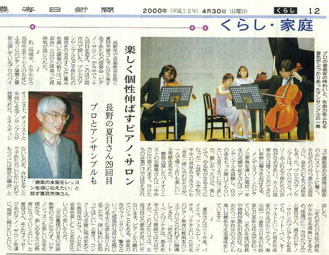 第29回ピアノサロンの様子が、地元の有力紙「信濃毎日新聞」(長野県で最も発行部数の多い新聞)に詳しく紹介されました。個人の音楽教室のコンサートが、記者の生々しい感動の声として報じられたことは、大変うれしいことです。今後とも、この報道の内容に応えられるようなコンサートを目指して、努力していきたいと考えています。