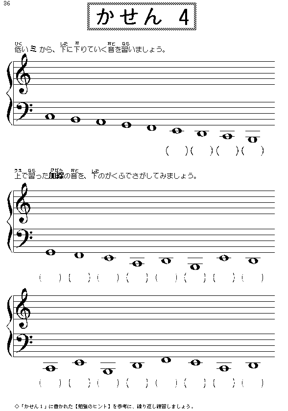 次の例は、ヘ音譜表の下に書かれた加線の音を学習する第1頁です。新しく習う加線の音が、それまでに勉強してきた音の延長上に並んだ音として導入されます。それにより、新しい加線の音が導入されるときは、それまでに自分が習って知っている音から推測して、それらの音が何の音であるかを、自分で考えて書き入れるようになっています。生徒が迷っているときは、先生はその推測を助ける助言をして、生徒自身にその音が何であるか、発見させるようにしましょう。
