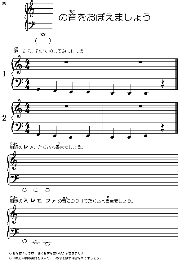 次の例は、ヘ音譜表の下に書かれた加線の音を学習する第2部第2頁です。この第2部では、加線の音を個々に取り上げます。短いメロディーを読んだり、歌ったり、弾いたりして、新しい加線の音に慣れます。書く練習もして、しっかり覚えるようにします。第1部と同様に、新しく習う加線の音は、生徒自身がそれまでに習った音から類推して探せるよう、既習の音から順次進行して出てくるようになっています。生徒自身に自分の力で発見していくように、上手に指導しましょう。