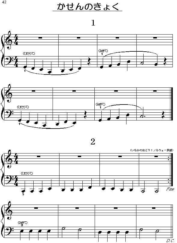 次の例は、ヘ音譜表の下の加線の音を学習する第3部第1頁の例です。第3部は、加線の音を含んだ8小節の短い曲をたくさん読んで弾く、実践的な勉強の場です。