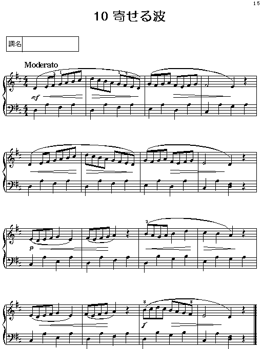 下に表示されている曲は、ニ長調の2番目の曲です。第1小節目から第2小節目にかけて上りと下りの音階が、調の導入時に習った音階の形そのままで書かれています。音階だけでひいていると、あまり表情のない形も、曲の中に使われたとき、「寄せる波」というタイトルにも表されているように、こんなにも表情豊かになります。そのような表情を感じ取って音階を勉強したとき、音階のひき方が、表現のためのテクニックとして身につくようになると思います。
