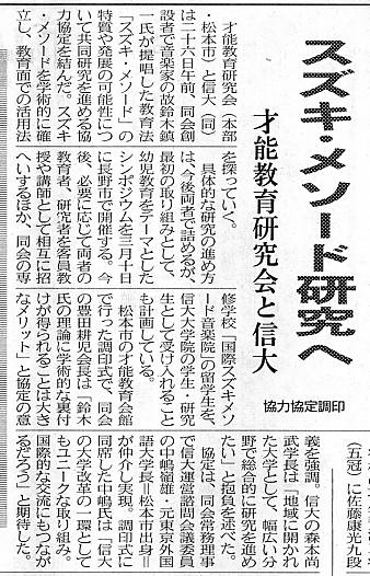 去る1月27日付け信濃毎日新聞は、「スズキ・メソード研究へ」という大見出しと「才能教育研究会と信大