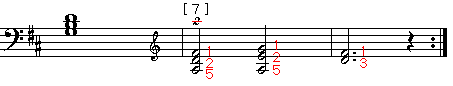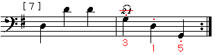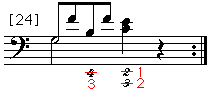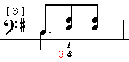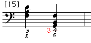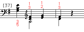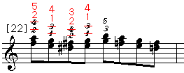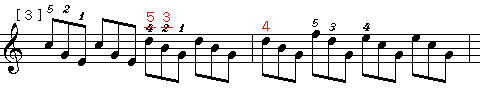 実は、二つ前の小節では、同じGHFのアコードが531と指定されています。この和音を取るには、この指使いの方が楽に、またしっかりとつかむことができるでしょう。よほどの事情がない限り、同じ和音は同じ指で取るようにして、指使いと音の配置に慣れる方がいいことを考えると、なおのことここは赤で訂正したように、531で取らせたいと思います。