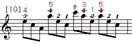 第10小節の指使いも、大きな手でなければひけません。また、第3小節以上に指の広がりが苦しいだけでなく、腕のローリングが使えない堅苦しい指使いですから、大きな手の生徒にとっても、あまり望ましい指使いとはいえません。よりスムースな指運びのために、以下の指使いを参考にして下さい。なお、この指使いは、第12、14小節も同様です。