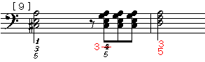 ただし、参考までに、似たような和音の進行であっても、次の例のように5の指を保持したまま、レガートな和音の運びを実現したい場合は、赤で指示した指使いがお薦めできると思います。