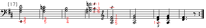 しかし、17小節目の和音を531で開始すれば、19小節目は42の指になり、31よりは次の#GHFの和音に近い手の構えでとることができます。そして、この#GHFの和音を531でとれば、541よりは容易につかむことができるでしょう。