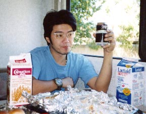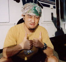 たしやんが手に持っているのはビールの空缶だが、上部をオープンに切り開いてマグカップとしたもの。