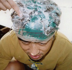 @スーパー袋をかぶり、A部分的に穴を開け、B髪をつまみ出し、C脱色剤を塗る。