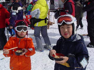シャルマン戸隠前で豚汁、樽酒、甘酒の振る舞い