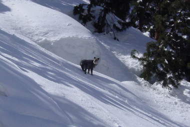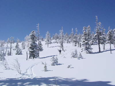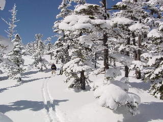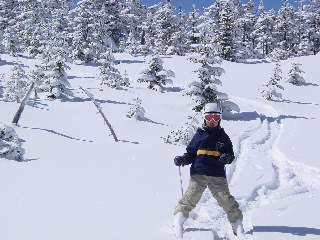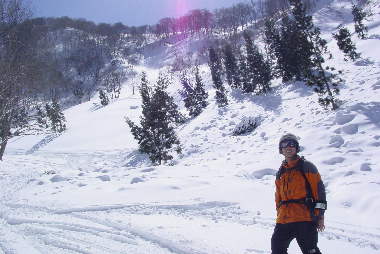 ゲレンデから外れて外れて立ち枯れ木&針葉樹の樹林帯でバックカントリーごっこ。