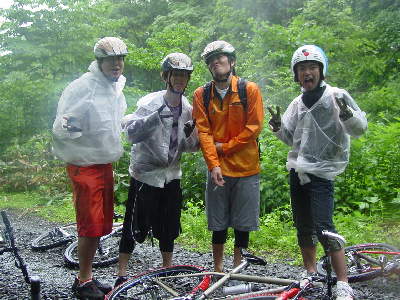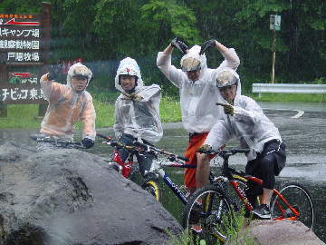 コンビニで380円で購入したおそろい合羽(チームジャケット?)を着込み雨の中にでる。