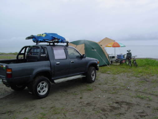 で、そぼ降る雨の中海岸線沿いに右往左往し、海に向かって細い道を抜けたところにテントを張れそうな海岸を発見。