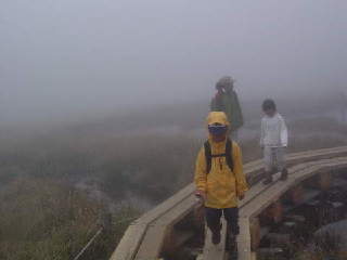 ガスってて四十八って言ってもいったい幾つあるんだかわかんねえ四十八池の木道を歩く。