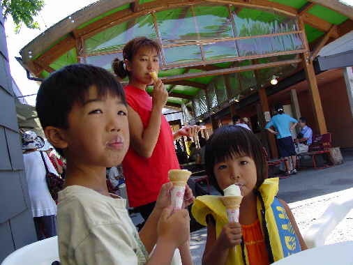 支流を遡り、上陸してお約束のわさびソフトクリームタイムとなった。