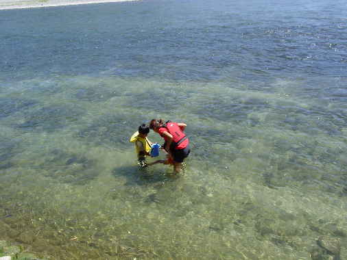 ところどころに現れる小さな落ち込みでは白波がたったウェーブができていて、カミさんも子供も大はしゃぎで波を乗り越えていく!
