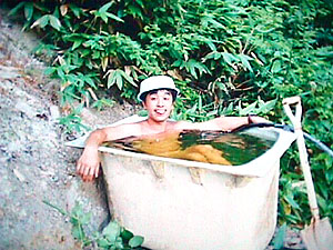源泉からひっぱったホースからは18リットル/分のお湯がとめどなく吹き出る。