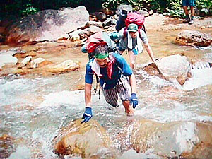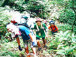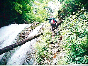 熊の爪痕が木に残る山深いキノコ沢を越えていく。