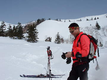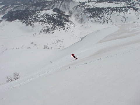 なんてことはなくでかい斜面なんで反対方面にトラバースして、俺もドロップ!