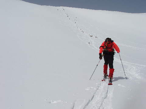 こんな死ぬほど急で雪崩れが追っかけてくるような斜面で
