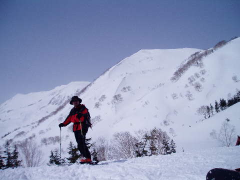 後方の山のてっぺんの三角のところから雪屁の内側を滑り込む様な感じで滑降したのよ。