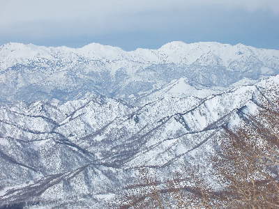真っ白な北アルプスの雪倉岳やその手前の小谷の大渚山の三角斜面。