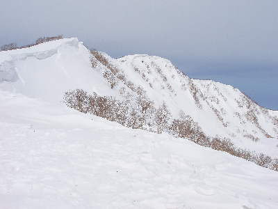細尾根に迷い込み降りるさいに若干の腐れ表層雪崩発生。