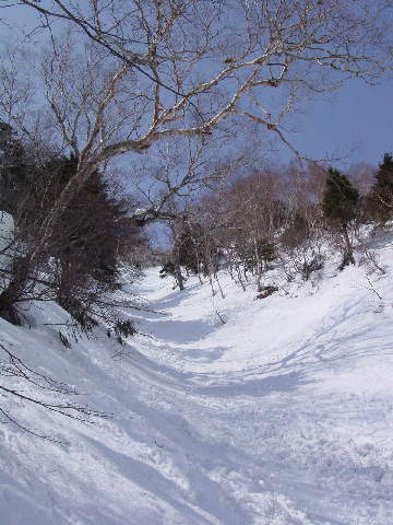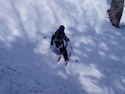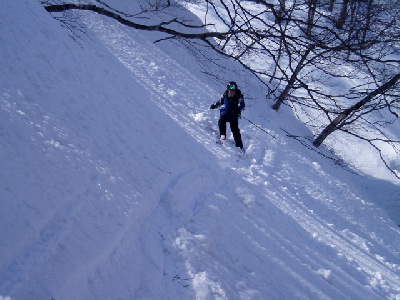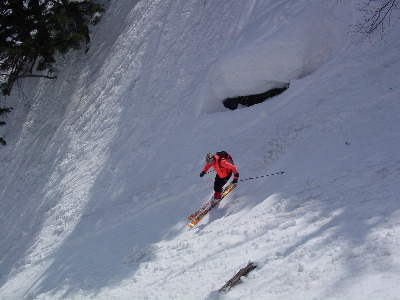 こりゃ、やばすぎるってんで大沢を末端まで滑るのは中止して途中から取り付きの尾根にトラバース