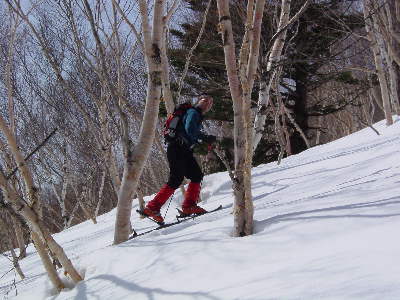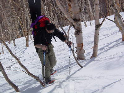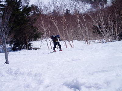 白樺の樹林帯を手馴れた感じでガシガシ登る大ちゃん。