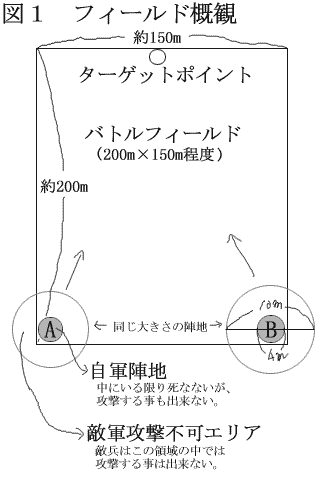 ゲーム進行 >まず、A,B両チームは共にターゲットポイントに集結し、双方の装備その他に不正などの無いことを確認の上、ターゲット(10kg程度の重量物。水の入ったポリタンクなど)をその場に設置する。その後両チームは別れて自分の陣地に向かい、到着したらロケット花火などで到着したことを相手に知らせて待機。お互いの花火が上がった所でゲームスタート。ターゲットポイントに侵攻を開始する。 その後は(相手を傷つけないなら)どんな方法を用いてもターゲットを取得し、自分の陣地にもって帰った方が勝利。 >1ゲーム終了後、陣地を交代してもう1ゲーム。先に2ゲーム先取した方のチームが勝ち。 ゲーム規定ルール >必ずフルフェイス着用。 >出撃の際は、一人当たりマシンガン系の武器は1丁(装備弾数は150発まで)、ハンドガン系1丁(予備マガジンの装備制限無し)まで装備可能(ナイフその他、近接武器は不許可)。 >銃撃戦の際に撃たれた者は、その場で「ゾンビ(或いはゴースト)」となって1ロストし、まず自軍の陣地へ帰らねば為らない(この時敵への妨害行為等はしては為らない)。自分の陣地内に帰った所で生き返り、「援軍」として再び戦場に復帰できる(3回まで)。3回ゾンビ化した者はその場で退場となる。また、ゾンビとなって帰還した場合に限り、マシンガン系のみ150発までの追加補給が受けられる。 >陣地は半径2m(直径4m)の円形で、その内部に居る者は敵の攻撃を受けてもゾンビには為らないが、攻撃することもできない。その外周3mの領域は敵軍攻撃不可エリア(図1参照)と為っていて、この領域に入った敵兵は攻撃する事ができない(したらその場で1ロスト)。 >戦闘中に誤ってバトルフィールドから出てしまった場合は、早急に元のフィールド内に復帰しなければ為らない(審判などが設置できる訳ではないので、各自の良識に任されるが)。またバトルフィールド外からの攻撃は、全て無効とする。 >ターゲットを自分の陣地に持って帰った方は、その場で勝利宣言する事でそのゲームは終了となる。 |