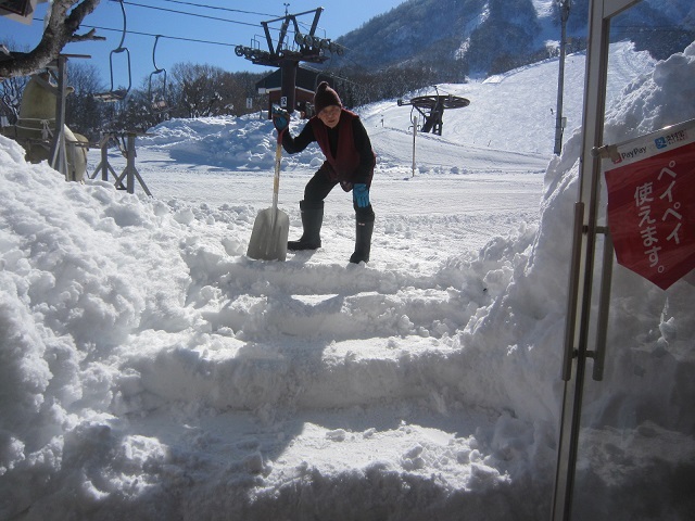 朝一番の圧雪の後 朝一番のグルービー前 玄関雪で4段の階段完成