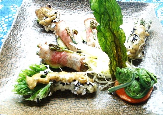 3牛タンの燻製春の香り 牛タンの燻製生ハムのように仕上げました・ごみ・タラの芽・こしあぶらの芽・ が並びます |